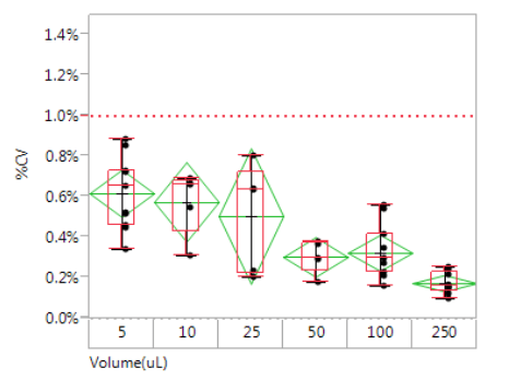 Se empleó un método colorimétrico para determinar la precisión utilizando volúmenes variables de una concentración conocida de colorante como muestra y pipeteándolo en un volumen conocido de solución de seroalbúmina bovina al 7 %. Se calculó la concentración del colorante y se realizaron las mediciones del suministro utilizando un espectrofotómetro. Se crearon tres perfiles de movimiento distintos para distintos intervalos de suministro de volumen (objetivos de 250 μL, 25-100 μL y 2-24 μL). Todas las pruebas, con 6 valores objetivo diferentes tanto a alta como a baja viscosidad, se realizaron con 10 réplicas por muestra utilizando un ciclo de pipeteo de 8 segundos, en 5 sistemas de pipeteo diferentes.